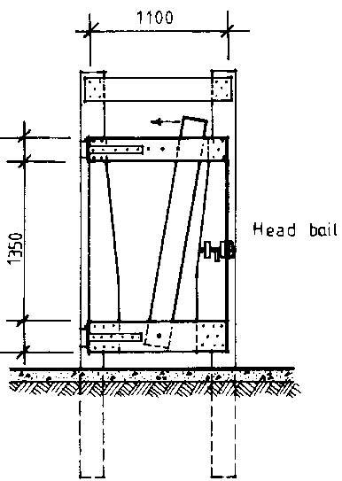 A simple crush need only consist of a head bail at the end of the race and a side opening gate in the last panel of the race. To improve access to the side of the animal, the gate can be split horizontally in halves so that the top half can be opened while the bottom half restrains the animal. It will also be advantageous to have a sliding gate or tail bar at the entrance of the crush to hold back animals and give easier access to the rear of the animal in the crush. The animals should not have to back up to leave the crush. This can be solved by having a side gate which opens at the front of the crush or the head bail constructed in a gate or a head bail constructed so that it can be opened wide enough for the animal to walk through. The head bail should fix the head of the animal with vertical bars since horizontal bars may cause choking of the animal should it collapse or slip. Dehorning however will require that the head be restrained both vertically and horizontally. In such cases a bar at the top and a chain in a quick release at the bottom will adequately hold the head.