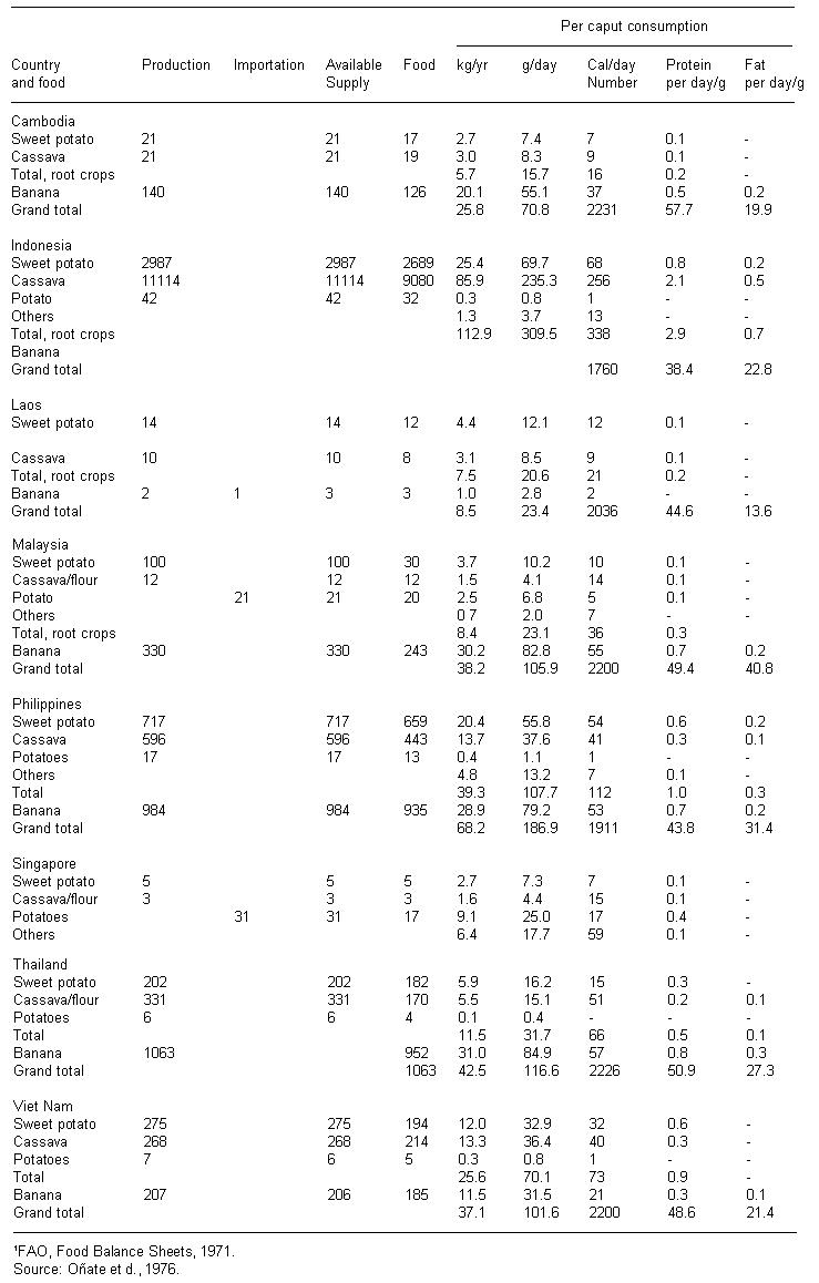 Root crops make an important contribution to the diet of many people in tropical countries, being consumed, as in the case of cassava, as a basic source of low-cost calories, or as a supplement to cereals. The cost of calories from cassava is about 25 to 50 percent that of the locally produced traditional grains and pulses (Goering, 1979), but other root crops, such as yams, are considerably more expensive. In most developing countries the dietary staples consist of starchy foods, which usually include some root crops. As indicated in Table 3.6, tropical roots may supply from as much as 1 060 calories per caput per day, (56 percent of the total daily calorie intake in Zaire), to as little as 200 calories (eight percent of the total daily intake in Belize).