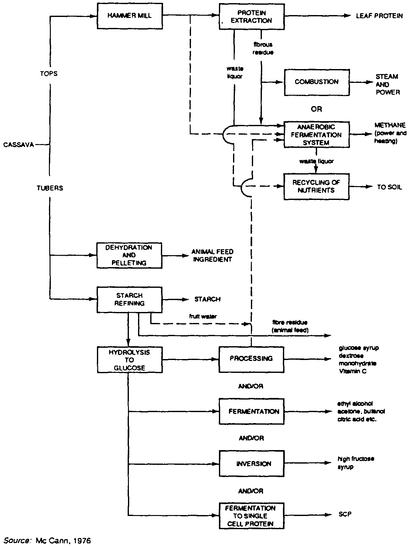 Starch can be hydrolysed to glucose and used as a sweetener. Starches from root crops are often more expensive than those obtained from cereals such as rice and maize. Increased production could possibly reduce root starch costs and make it more competitive. Fig. 8.1 presents a diagram of a potential agroindustrial system for cassava utilisation.