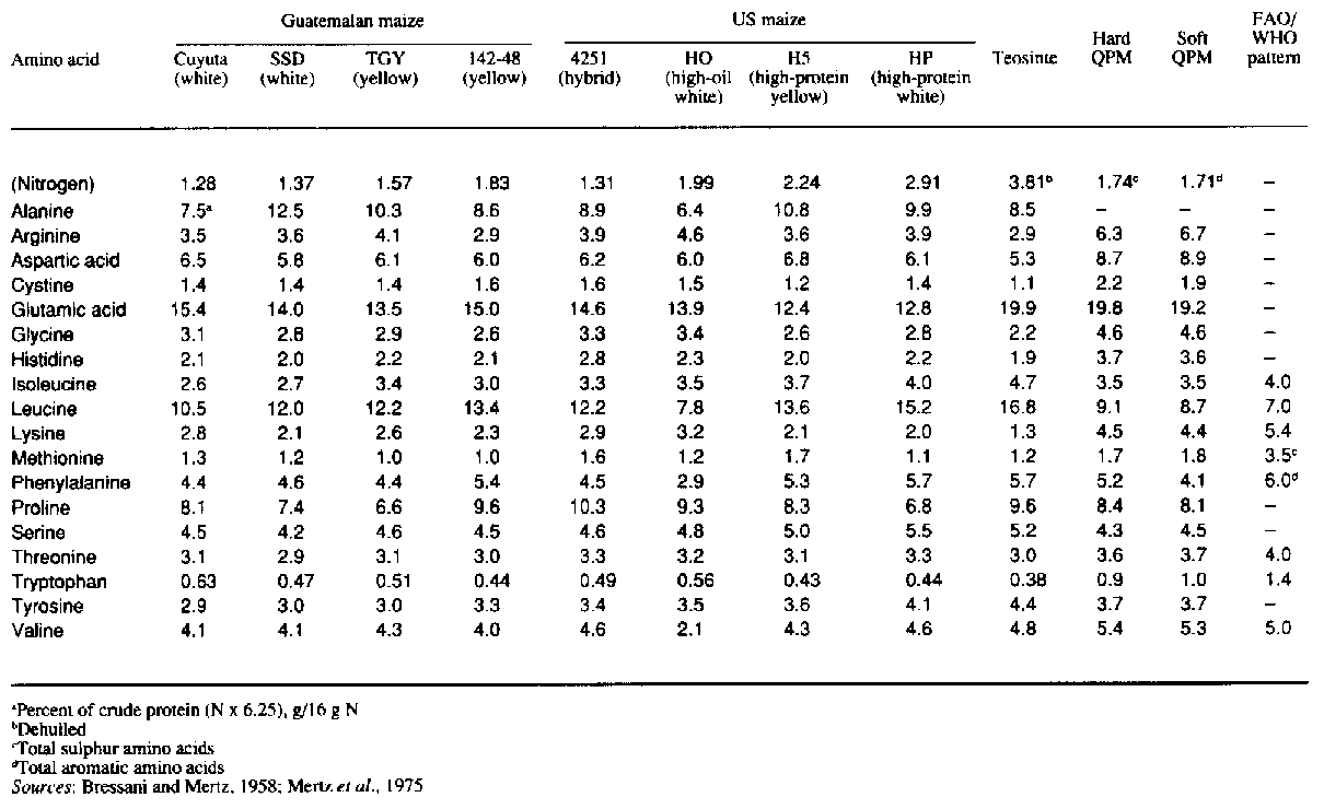 The nutritional quality of maize as a food is determined by the amino acid make-up of its protein. Representative amino acid values are shown in Table 10 for both common maize and QPM. To establish the adequacy of the essential amino acid content the table also includes the FAD/WHO essential amino acid pattern. In common maize, deficiencies in lysine and tryptophan are evident as compared with QPM. An additional important feature is the high leucine content in common maize and the lower value of this amino acid in QPM.