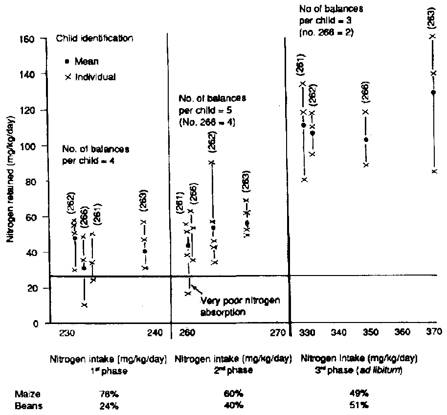 Baptist and de Mel (1955) obtained a highly satisfactory response in 23 Ceylonese children one to six years old fed a mixed diet of three cereals and four legumes supplemented with skim milk. On the other hand, Navarrete and Bressani (1981) reported from nitrogen balance studies in adults that a bean diet produced nitrogen equilibrium at an intake of 114 mg N per kg per day; however, an 87:13 maize/bean mixture induced nitrogen equilibrium with an intake of 98 mg N per kg per day.