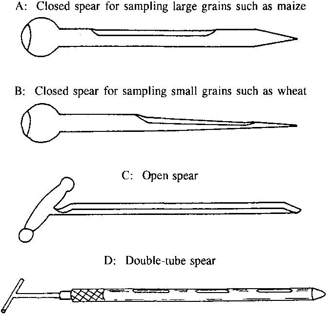 Double-tube sampling spears are designed primarily for obtaining samples from vertical lines of penetration in bulk grain, although small versions may be used for sampling bagged grain. They are superior in many ways to the simple bag sampling spear, but are still instruments of haphazard rather than representative sampling.