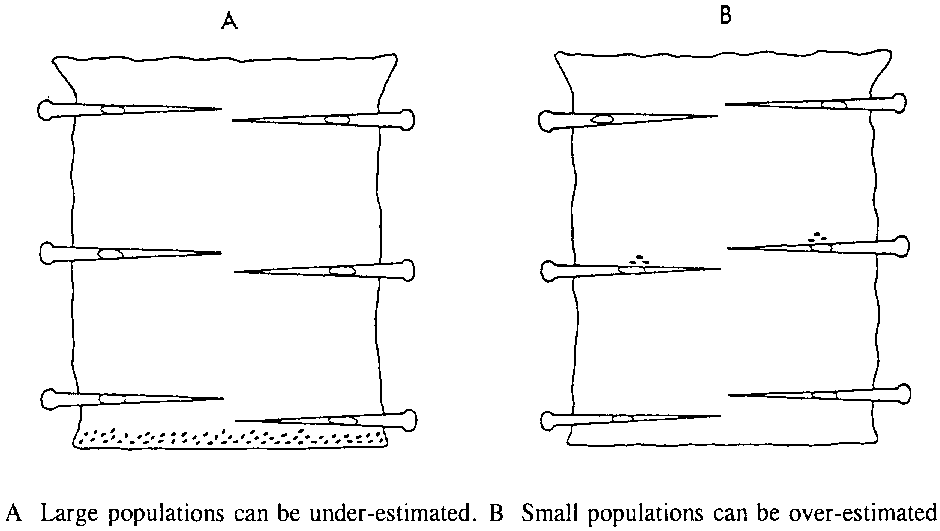 The main disadvantage of obtaining samples with these instruments is that it does not conform to the basic principles of representative sampling. If foreign matter or defective grain happens to be very unevenly distributed in the bag, the haphazard nature of spear sampling could lead to a distorted quality assessment (Figure 3.3. Inadequacy of Spear Sampling. Black dots represent grain defects).