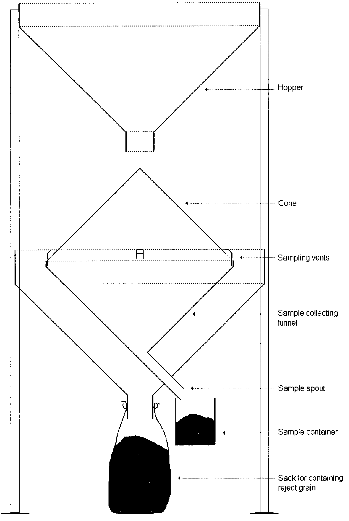 This sampler (Figure 3.4. Vertical section of Produce-flow Sampler.) was designed at the Tropical Products Institute, now a part of NRI, as a representative sampling device for bagged grain. Grain is tipped into the hopper and falls through onto a cone, which is positioned to ensure that the flow is evenly distributed. Some of the grain is trapped by four vents arranged equidistantly around the base of the cone, and directed via a separate spout into a sample collector. The size of the sample depends upon the dimensions of the vents, which are interchangeable. Sampling of a 100kg bag of grain is complete within 20 seconds of starting the flow.