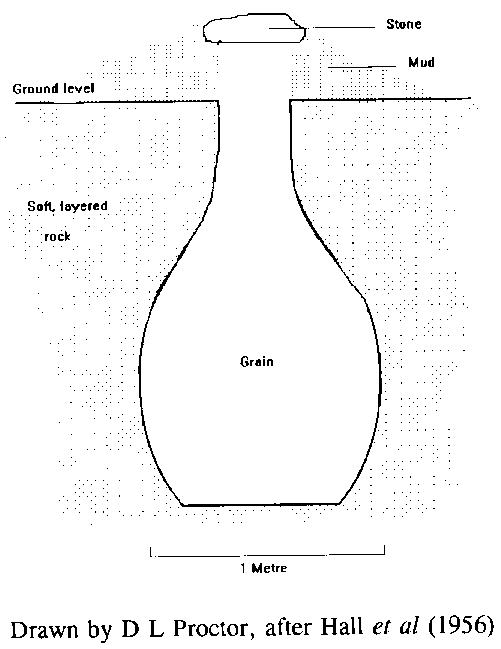 Practised in India, Turkey, sahelian countries and southern Africa, this method of storage is used in dry regions where the water table does not endanger the contents. Conceived for long term storage, pits vary in capacity (from a few hundred kilogrammes to 200 tonnes). Their traditional form varies from region to region: they are usually cylindrical, spherical or amphoric in shape, but other types are known (Gilman and Boxall, 1974). The entrance to the pit may be closed either by heaping earth or sand onto a timber cover, or by a stone sealed with mud (Figure 6.6. Vertical section of a Cyprus village underground grain store.).