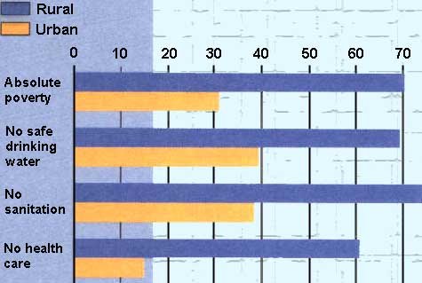 Percentages of rural and urban populations living in absolute poverty or lacking access to essential services in the 45 least-developed countries