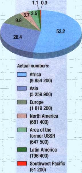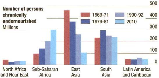 People in drought-prone areas live under a continuous threat of hunger and malnutrition. Droughts in Africa during the 1980s forced 10 million farmers to abandon their land; over 1 million died. The impact of the drought was exaggerated in Ethiopia by government policies which reduced the reserves of food grains held on farms. The cost in lives would have been far greater but for the mobilization of food aid by the international community.