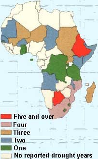 Droughts Number of drought years experienced by each country, 1980-91 Boundary of Eritrea, formed since 1991, is shown in grey Source: USOFDA, 1991 |