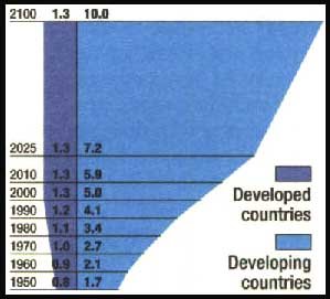 The population of most developing countries is still growing rapidly, even though the rate of growth has slowed down. Every year the global population increases by 90 million. Most of the increase, around 95 percent, takes place in the developing world. Populations in most developed countries are increasing only slightly, if at all; in some of them, such as Germany and Hungary, they are even falling.