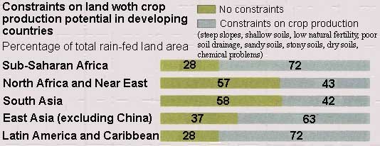The earth could, in theory, feed very many more people than now inhabit the globe. But, in practice, good soils, favourable climates, rainfall and fresh water are unevenly spread around the world - and do not necessarily correspond to distribution of population. So while some countries can produce an excess of food, others struggle with inadequate resources. Many developing countries are overexploiting their soils and several need to wrest food from land poorly suited to agricultural production.