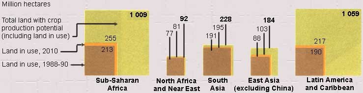 Against this background, FAO's 1995 study, World Agriculture: Towards 2010, estimated net cereal import requirements increasing from about 8 million tonnes to 19 million tonnes for sub-Saharan Africa; 38 to 71 million tonnes for the Near East and North Africa; 27 to 35 million tonnes for East Asia (excluding China); and 5 to 10 million tonnes for South Asia, primarily as a result of shortages of arable land.