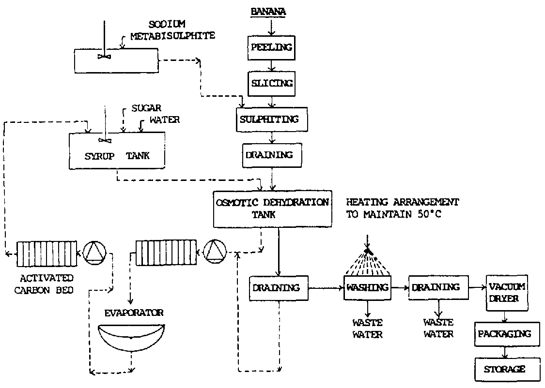 Commercial feasibility of the process on bananas has been studied, based on the results of a semi-pilot scale operation; the process scheme is reported in Figure 8.4.3. Osmotically dried bananas retained more puffiness and a crisper texture than simple vacuum dried ones, and the flavour lasted longer at ambient temperature.