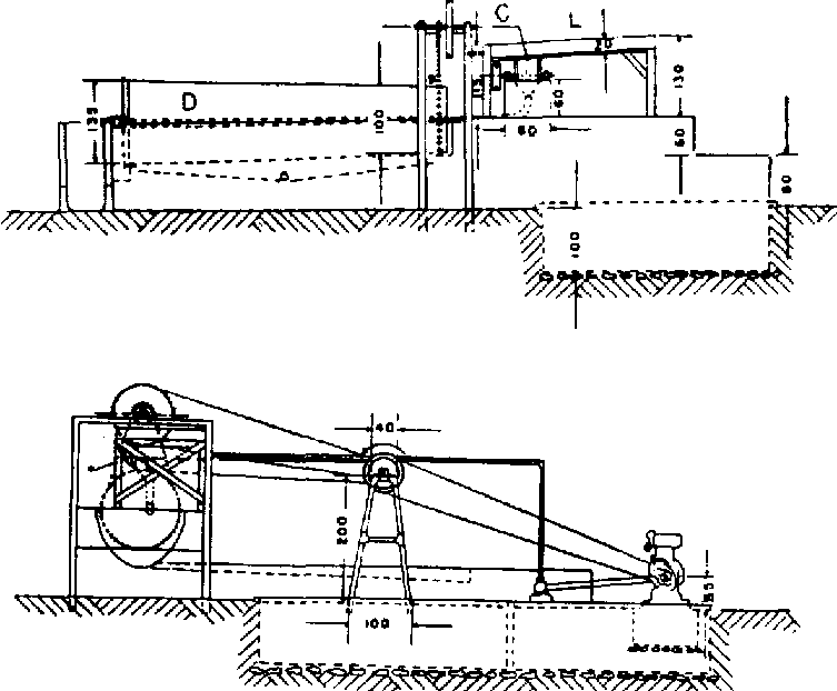 Figures 34 and 35 show the main elements of a typical medium-size factory with a capacity of 2-3 tons of dry flour per day. The arrangement and dimensions, given m centImetres, are those recommended by an expert with long practical experience. Figure 34 shows vertical sections of the arrangement through the axis of the rotating screen (above) and perpendicular to this axis (below). The peeled roots are stored in basin A, washed in basin B, and transferred from the latter basin to the rasper (C), mounted on a rasping table (L in Fig. 35). A 20-hp diesel engine (H) coupled to the pump (G), which supplies water from the well (F), drives both the rasper (at 800 rev/min) and the rotating screen (at 120 rev/min) via the transmission gear (1). The flour milk passes from the rotating screen (D) to the flour table (E), which has a slope of about I percent.