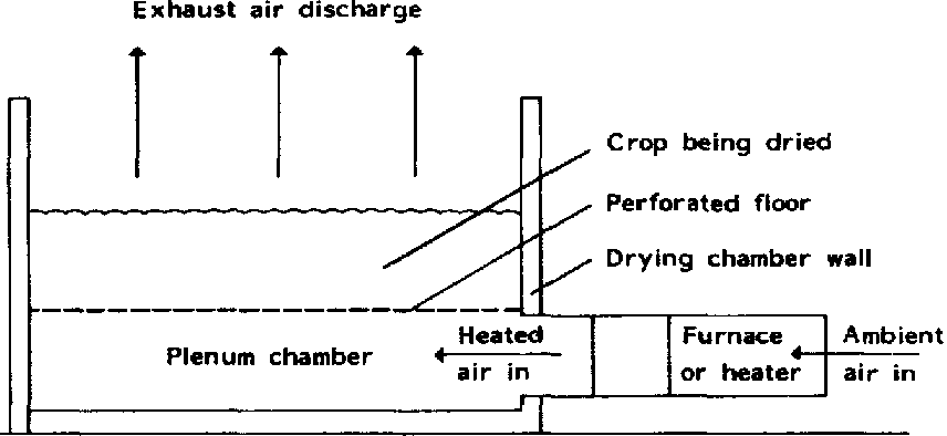 Another form of drier is the force-ventilated batch drier. In its simplest form this consists of a perforated floor overlying a plenum chamber. A fan passes air through the crop spread on the perforated floor. Normally the air is heated before being passed through the crop. After drying, the crop is removed, cooled and stored. This system dries crops quickly but is expensive to construct. It also requires components which are not readily available to the farmer. Moreover, it involves expenditures on fuel to drive the fan and maintenance of the equipment. There are many examples of this type of drier; a typical drier is illustrated in Figure 6.10.