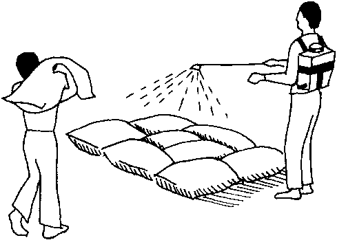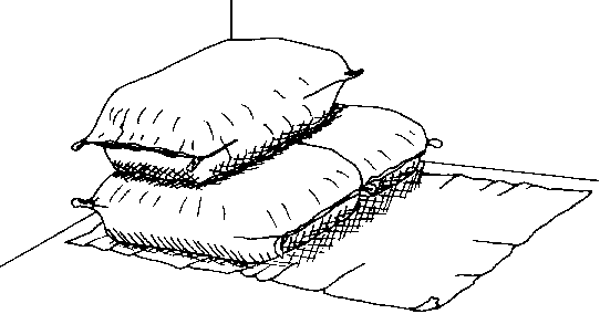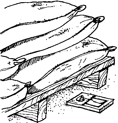 Ultimately, the most satisfactory method of insect elimination and control in bagged grain is by fumigation. A gas is released among bags covered by a gasproof sheet, which is held down by "sand snakes" or a heavy chain wrapped in hessian (see Fig. 7.13). The sheeted stack is left for at least three days.