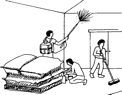 Spraying or dusting successive layers of sacks with insecticides (as shown) is less hazardous to humans, but is not always effective. Recently, however, pirimiphos-methyl (as emulsifiable concentrate, Actellic 50 ec) was applied undiluted (50 ec) at the rate of two to three strokes per bag with a simple domestic applicator; and it largely eliminated weevils from heavily infested sacks of maize and kept the population at a very low level even after eight months. But there is always a danger in applying undiluted insecticides.