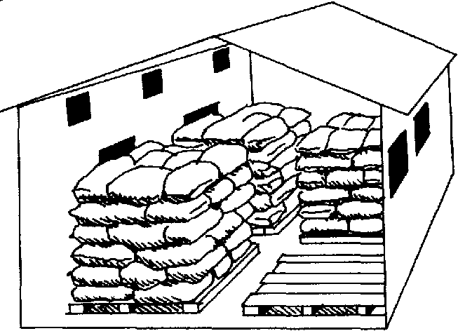 If sacks are laid on top of one another, with no overlap in successive layers, the stack will be very unstable. The recommended alternative is to "tie" successive layers by arranging the sacks differently in each layer. This not only produces a safer stack, it also makes stock-taking easier as the bags can quickly be counted.