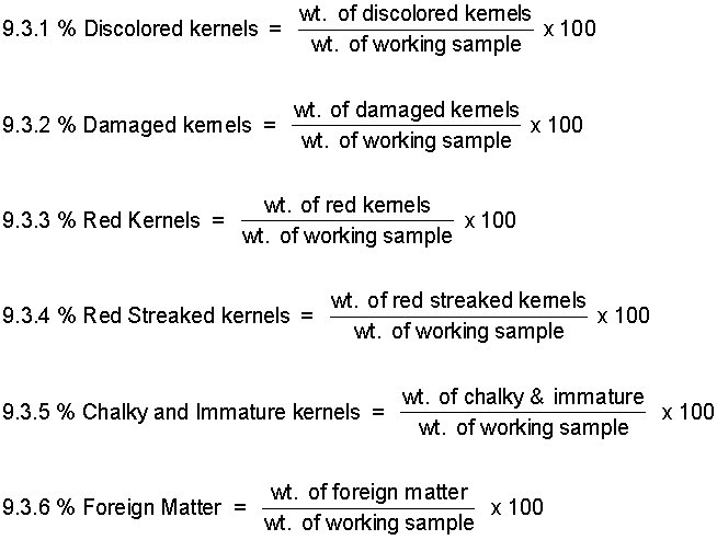 9.3 Weigh each component and calculate the percentage using the following formulas: (Chalky and immature kernels are combined and treated as one component)