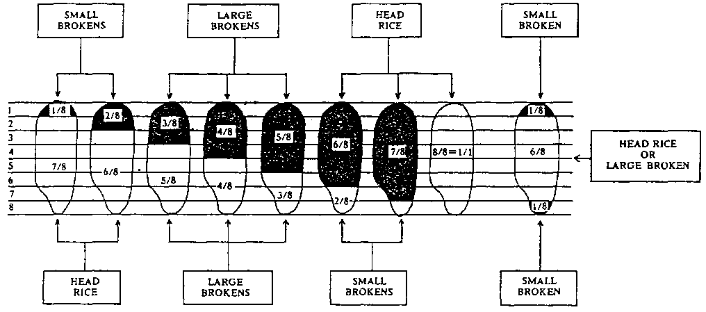 5. Brokens in milled Rice -The definition of brokers is generally based on the length of the rice particle and is referred to in units 118th of the length of the whole unbroken milled rice grain. These are categorized as:
