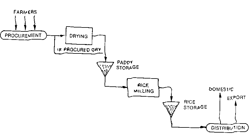 As shown in the diagram, there are two points at which the storage operation is taking place - after procurement (or drying) and just before distribution. Procurement is dictated by production in terms of timing quantity and quality. It is generally predictable and therefore the paddy storage operation can be programmed.