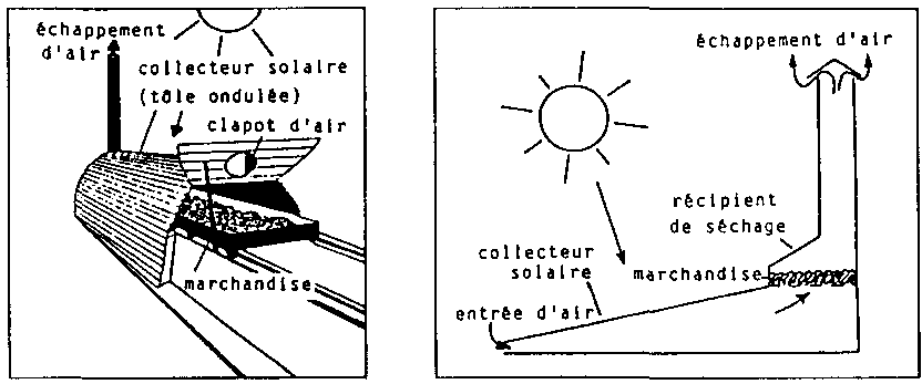 Du point de vue technique, il n'a pas été par ailleurs possible jusqu'à présent de résoudre le problème qui consiste á produire sans employer de ventilateurs un courant d'air suffisamment puissant pour évacuer avec assez de rapidité l'air sature d'humidité á la suite de son passage á travers la marchandise. Ce phénomène est susceptible de produire une certaine condensation au niveau de la marchandise voire de provoquer la formation de moisissures. On peut s'attendre malgré tout - si l'on tient compte en l'occurrence des besoins des utilisateurs - á ce que l'usage des systèmes de séchage solaire connaisse á l'avenir une plus grande faveur.