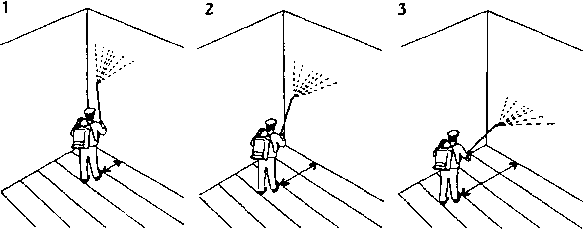 Ao efectuar um tratamento de superfícies, e importante proceder sistematicamente. Nas paredes pode-se alcançar uma distribuição uniforme pulverizando da forma indicada nas ilustrações seguintes: