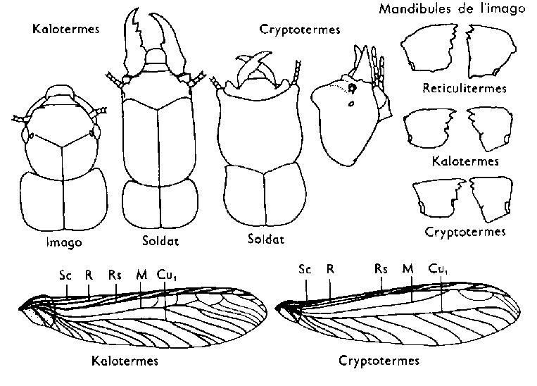 a) Tête allongée, ovale, avec suture en Y; mandibules dentées (fig. 26A et 28)...................Kalotermes HAGEN, 1873, Neotermes HOLMGREN, 1911, Glyptotermes FROGGATT, 1896 etc. Répandus dans le monde entier, de préférence dans le bois mort sans relation avec le sol: quelques espèces dans des branches dépérissantes sur des arbres vivants. A signaler ici l'espèce K. flavicollis (FABRICIUS, 1793) (fig.26) répandue dans les régions méditerranéennes.