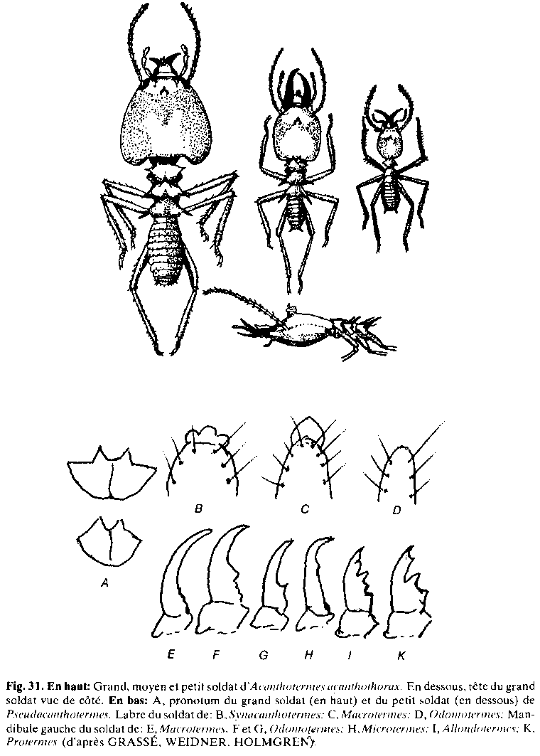 Il existe aussi quelques espèces indo-malaises de ce genre; elles construisent les plus grandes termitières dans leur aire de répartition. f) Mandibule gauche avec une profonde échancrure un peu au-dessus de son milieu. suivie d'une petite dent (fig. 31 K). Mandibule droite avec une dent. Antennes 14 articles.................................. Protermes, HOLMGREN, 1912
