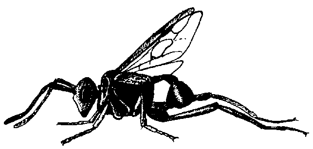 1. L'abdomen fait directement suite au thorax, sans étranglement (fig. 33 Symphyta). Insectes au corps cylindrique et allongé de 1-4 cm de long. Femelles munies d'une longue tarière........ Siricidés (Siricidae)