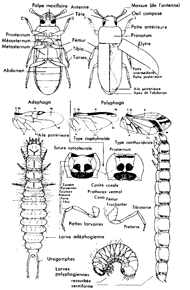 - Aux pattes postérieures, le trochanter est formé d'un seul article (fig. 33, Aculeata). Insectes de taille moyenne à grande, avec de nombreuses formes aptères. Les espèces avec nervation réduite des ailes possèdent un champ anal à l'aile postérieure (fig. 40 G) ...............Porte - aiguillon (Aculeata)