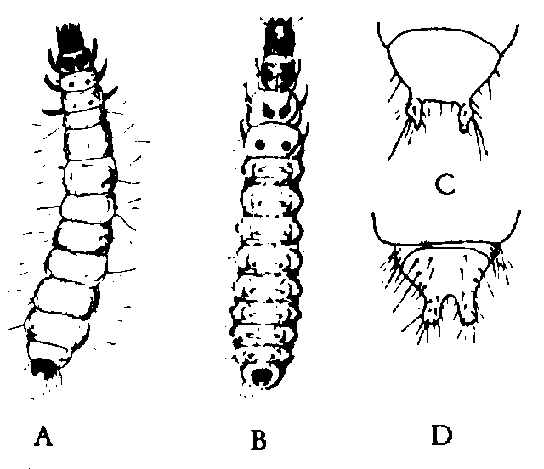 1. Sur le 9e segment abdominal, 2 fortes épines (urogomphes) qui, chez les jeunes larves, sont encore petites et n'ont pas atteint leur forme caractéristique. Le tergite et le sternite de chaque segment abdominal sont soudés; ceux du 10e segment forment un anneau complet tandis que sur la face ventrale apparaît une ligne médiane claire qui peut être de largeur variable sur les différents segments (fig. 75H, K). Sur le côté dorsal, en arrière du bord antérieur des segments abdominaux 3-10, se trouve une rangée de petites plaques sclérotinisées, rondes, cordiformes, ou en forme de bouteille ou de calice. Larves allongées avec soies denses et hérissées (fig. 74 A). Pour l'identification spécifique, des larves d'au moins 12 mm sont nécessaires