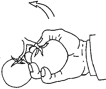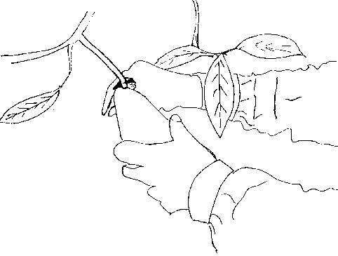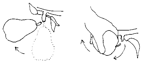Dans le cas de certaines plantes, un point de cassure se forme naturellement à la jonction du tronc et de la tige quand la plante est mûre. Les cueilleurs devraient saisir le fruit ou légume avec fermeté et douceur et tirer vers le haut, comme dans l'illustration ci-dessous. Pour réduire les dégâts mécaniques pendant la récolte, porter des gants de coton, se couper les ongles à ras, et se débarrasser de bijoux tels que bagues et bracelets.