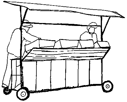 Les ouvriers chargés du conditionnement en plein champ trouveront utile cette simple charrette. Elle est munie d'un râtelier pour les caisses et d'un toit pour abriter du soleil la cueillette. La charrette est conçue pour être poussée le long du bord extérieur du petit champ où se fait la récolte.
