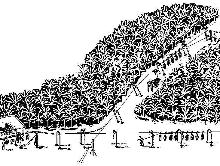 Lorsque la récolte s'effectue à une certaine distance du lieu de conditionnement, il s'agit de transporter la récolte avant de la conditionner. Ci-dessous: la chaîne de manutention pour bananes commandée par gravité nous montre jusqu'à quel point on peut réduire la manutention en préparant le produit pour la vente. Une fois cueillies, les bananes arrivent aux quais placés le long du trajet de la chaîne, puis on les soulève et on les suspend à des crochets attachés au fil de métal. La vitesse de transport est sous le contrôle d'ouvriers qui acheminent les bananes jusqu'au site de conditionnement au bas de la colline.