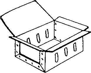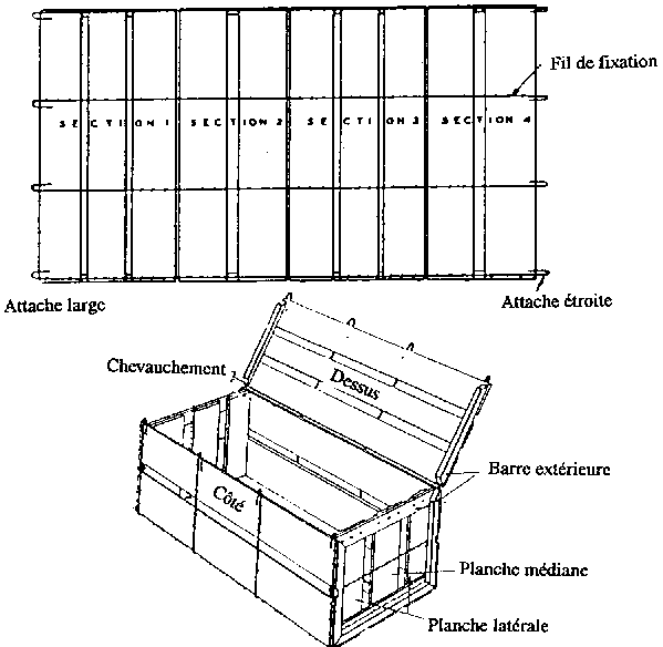 On peut construire des conteneurs en bois et en fil métallique en suivant les schémas généraux ci-dessous. Un outil spécial de fermeture facilite le pliage des boucles de fil métallique sur le couvercle de la caisse. Les caisses assujetties par du fil métallique s'emploient pour de nombreux produits tels que les melons, les haricots, les aubergines, les légumes feuillus, les poivrons, les courgettes et les agrumes. Package Research Laboratory (41 Pine Street, Rockaway, New Jersey 07866, USA) peut vous fournir une liste de fournisseurs dans différentes régions des USA.