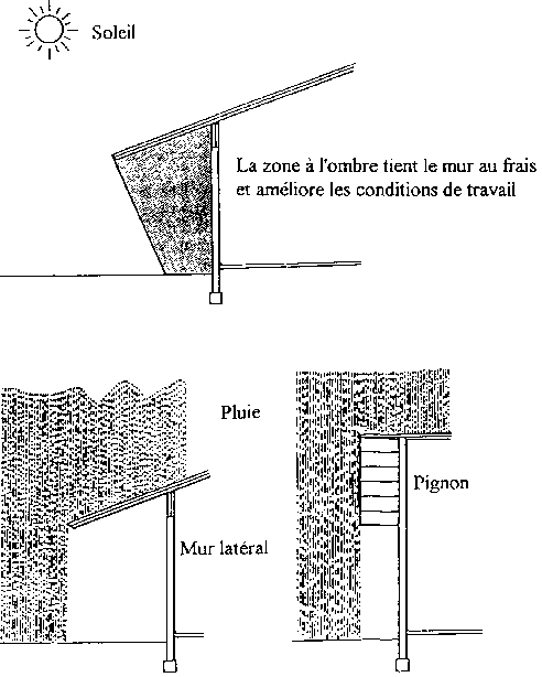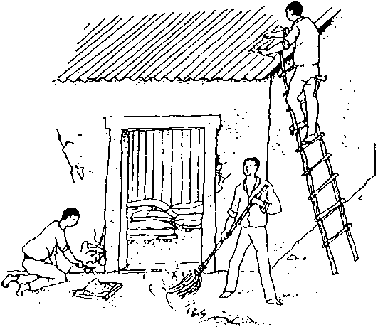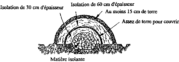 Pour de grandes quantités de pommes de terre, on peut construire un entrepôt autoporteur en forme de cadre triangulaire. On creuse une tranchée d'environ 3 m de profondeur et l'on place des conduits de ventilation le long du fond. Le toit du bâtiment est fait de bois recouvert de paille et de terre.