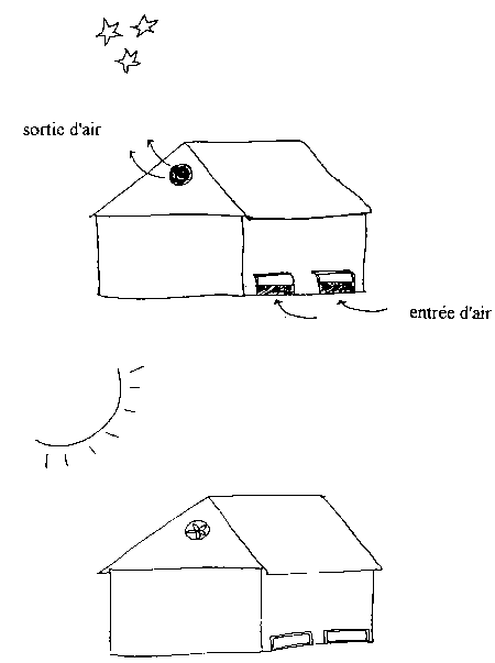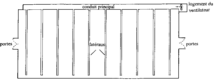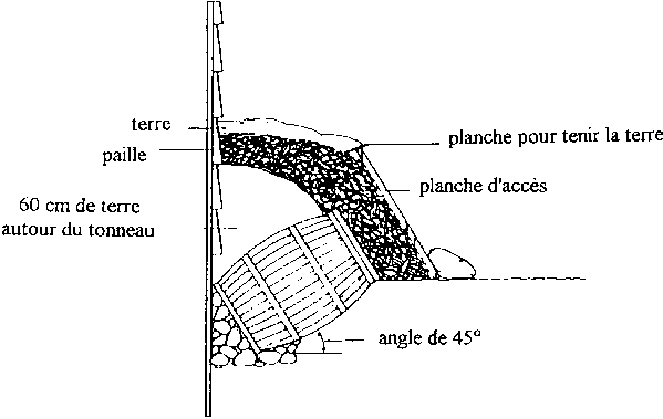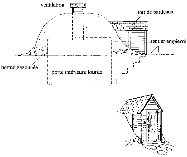 Les conduits de ventilation pour les entrepôts peuvent être verticaux ou horizontaux. L'entrepôt à pommes de terre montré ci-dessous apporte une bonne ventilation grâce à des matériaux simples. L'entrepôt peut être de n'importe quelle taille ou forme puisque les conduits peuvent être placés de manière égale partout.