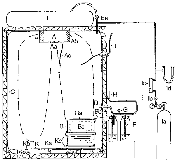 A - évaporateur Ab - ventilateur Ab - serpentin Ac - drain de dégel B - épurateur Ba - coulisse Bb commande de l'épurateur Bc - chaux C - polyuréthanne pulvérisé D - bague avec rebord de tuyau intérieur E - sac de respiration Ea - vanne F - vannes de surpression "automatiques" G - vanne de surpression manuelle H - manomètre différentiel I - système de purge de l'azote Ia - cylindre de l'azote Ib - vanne compteur Ic - compteur purgeur Id - vanne de sécurité J - tuyau de test K - faux plancher Ka - 5 cm x 10 cm Kb - joint de plancher en polyuréthanne Kc - arrimage
