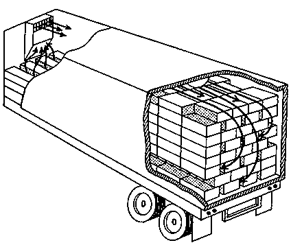 Seule la charge au fond à droite est tout à fait protégée du transfert de chaleur. L'emploi de palettes tient les cartons éloignés du plancher tandis que le chargement central laisse un espace d'isolation entre les palettes et les murs extérieurs.