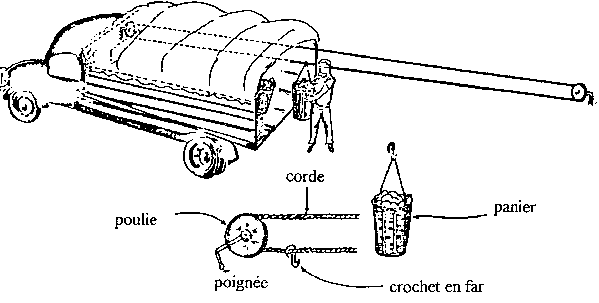 On peut construire un dispositif simple pour faciliter le travail de déchargement du véhicule de transport en employant deux poulies et une corde solide. On peut monter une poulie à l'intérieur du camion à l'avant du plateau, et la seconde sur un montant portatif ou sur un objet immobile comme le mur d'un bâtiment. Les récipients peuvent être directement suspendus par leur poignée ou placés dans une élingue.