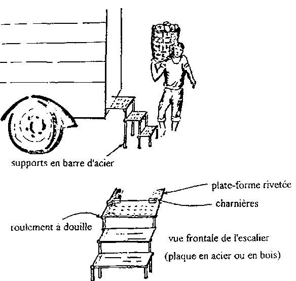 On peut construire un simple escalier pour faciliter le chargement et le déchargement des produits. L'escalier illustré ici peut être replié et remisé à l'arrière du camion quand le véhicule est en mouvement. Les marches peuvent être faites de plaques de bois ou de métal et on peut employer des montants en acier comme supports.