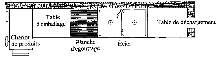 Il peut falloir laver, parer, mettre en bottes ou trier certains produits au niveau de vente en gros ou au détail. La disposition de la station de travail pour la manipulation des produits à destination doit être organisée de manière à minimiser les mouvements improductifs. Dans l'illustration ci-dessous, une table de déchargement est située à côté d'un évier pour laver le produit et une planche d'égouttage est placée juste à côté de l'évier. Une fois le produit sec, les cartons peuvent être remplis et placés sur un chariot situé juste à droite de la table d'emballage. Cette disposition permet à un opérateur seul d'effectuer facilement toutes les étapes de manutention et plusieurs personnes peuvent travailler côte à côte.
