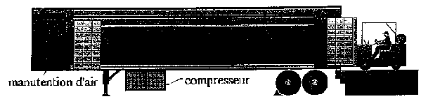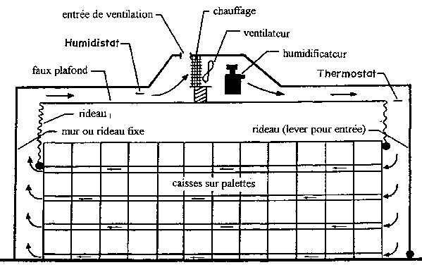 L'illustration suivante est une chambre de mûrissage pour les agrumes en caisses sur palettes. Le plafond de la pièce est assez haut, permettant des piles de 4 boîtes de haut. On a ajouté un faux plafond pour permettre une bonne circulation de l'air à travers la pièce. Pour de plus amples informations sur la construction de la chambre, la gestion de la température et de l'humidité relative, référez-vous à l'article intitulé "Ripening Facilities" (Installations de mûrissage) (Thompson, 1994) à la section de référence de ce manuel.