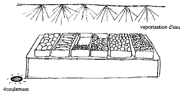 On peut maintenir une haute humidité relative à l'étalage en vaporisant les légumes à feuilles et les produits qui tolèrent l'eau avec de l'eau propre et fraîche. On peut construire un simple arroseur en perçant un tuyau de petits trous et en le connectant à un tuyau d'eau. Si on emploie l'étalage à l'extérieur, il faut qu'il soit à l'ombre.