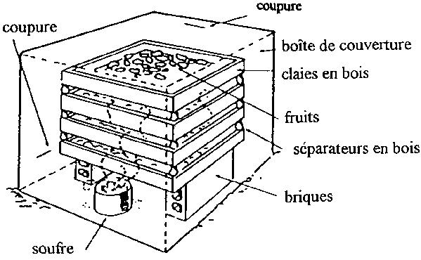 On peut construire une de soufrage peu coûteuse à partir d'une grande boîte en carton que l'on perce en plusieurs endroits pour permettre une bonne ventilation. Des claies de séchage peuvent être empilées en employant des espaceurs en brique ou en bois. Les claies doivent être complètement en bois car les vapeurs de soufre corrodent le métal. L'ensemble doit être placé à l'extérieur, de préférence à même le sol nu.