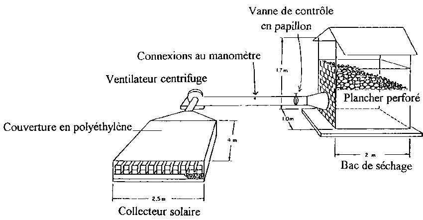 Le séchoir solaire pour copeaux de manioc illustré ci-dessous consiste d'un collecteur solaire, d'un ventilateur et d'un bac de séchage. Le collecteur solaire est construit sur une base en béton, constitué d'une couche de petites pierres et de deux couches de blocs en béton, le tout recouvert de polyéthylène.