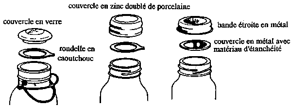 Bocaux de mise en conserve avec couvercles. De gauche à droite: type boule, couvercle en zinc, et deux pièces