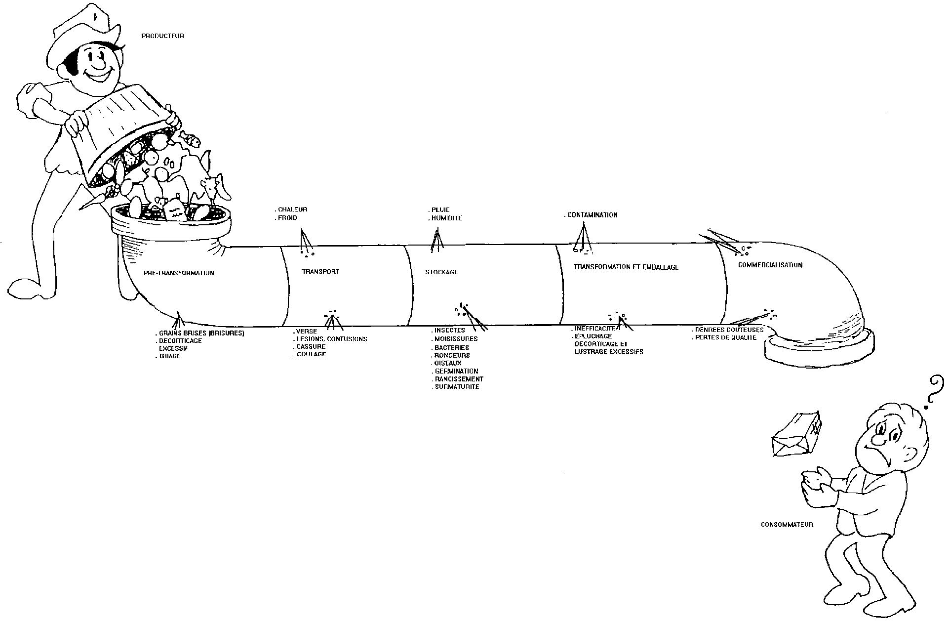 De telles négligences ou omissions, s'ajoutant à l'incertitude même de l'origine des chiffres, laissent perplexe. En réalité, elles sont le reflet d'un problème plus général, celui de la fiabilité des informations existantes. Pour parvenir à suffisamment de rigueur et d'homogénéité, une question de méthode se pose. En premier lieu, il convient de définir les bases du raisonnement. Quelles sont les opérations couvertes par le système après récolte? Quel est le point de départ et où doit-on s'arrêter? Sur quelles bases les pertes doivent-elles être calculées: quantités moissonnées, ou espérées, ou encore estimées? Doit-on partir du rendement théorique à l'hectare ou du rendement constaté? Les opérations après récolte font-elles partie du cycle de production, ou bien sont-elles rattachées au secteur de transformation et de distribution des produits?