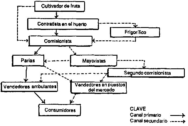 En casi todas las cadenas de mercadeo hay una fuerza comercial dominante. En este caso es el comisionista. Aunque a primera vista su función parece ser únicamente la de un subastador de los productos en el mercado mayorista, que recibe una pequeña comisión, en la práctica su actividad es semejante a la de un banco, que concede crédito, aparentemente sin interés, a los agricultores, contratistas y mayoristas. Al conceder el crédito asegura su intervención en la comercialización de los productos.