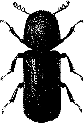 a) Petit coléoptère de forme presque cylindrique, dont la tête est « repliée »sous le thorax de sorte qu'elle est invisible du dessus. Sur le thorax est disposée toute une série de protubérances, comme le montre le croquis. Dinoderus spp. (également de la famille des Bostrychidue) apparaît parfois aussi dans le maïs. Il présente une forme cylindrique semblable, mais nettement plus courte et plus trapue.